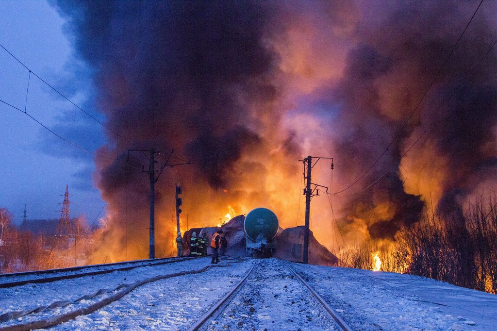 當(dāng)?shù)貢r間2014年2月5日,俄羅斯莫斯科,俄羅斯一列運(yùn)載液化天然氣的列車5日凌晨發(fā)生脫軌側(cè)翻,導(dǎo)致液化天然氣泄漏并引發(fā)大火,所幸沒有造成人員傷亡。