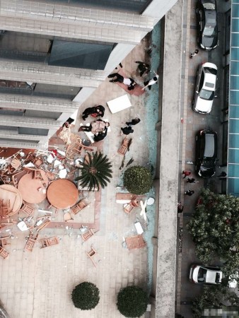 隨后,余海培通過窗戶看到了在M層的平臺(tái)外,餐廳內(nèi)有人被巨大的沖擊力沖出室內(nèi),躺在該平臺(tái)上?!拔覀兙涂吹接袀€(gè)女孩子外面哭?!?