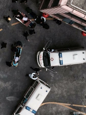 余海培從樓上看到平臺(tái)上有很多碎玻璃與碎椅子?!爸辽賰扇颂芍粍?dòng)不動(dòng),臉上和木板上都有血,有的被氣浪沖擊出來的過幾分鐘可以自行起來?!?