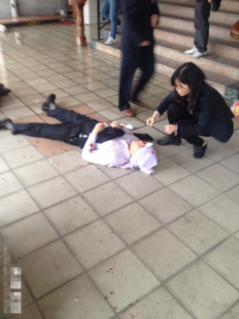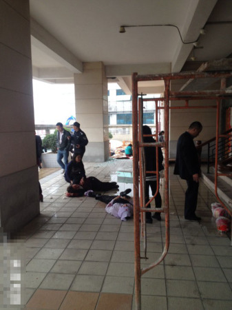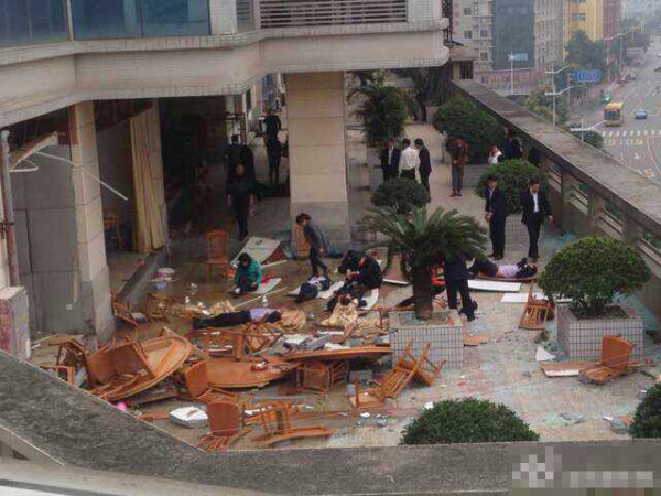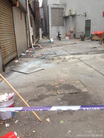 3月3日上午12時(shí)10分,廣東東莞旗峰路中僑大廈四樓餐廳發(fā)生爆炸,已造成1人死亡,20多人受傷。從樓上可看到外面平臺(tái)很多碎玻璃與碎椅子,至少兩人躺著一動(dòng)不動(dòng),臉上和木板上都有血。@王萌moe